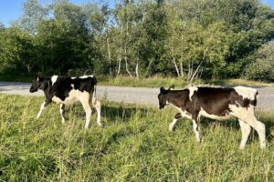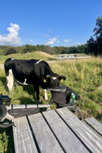Gerade wo ich das hier schreibe, bekomme ich noch Besuch zum Abendessen. Heimlich, still und leise hat sich hier eine Kuh mit zwei Kälbchen angeschlichen. War sehr interessiert am Rad und am Abendessen. 🥰😍